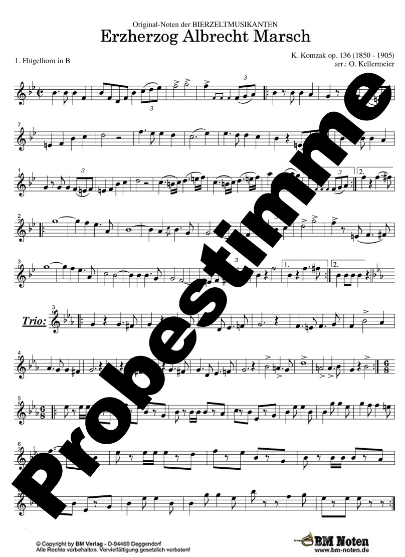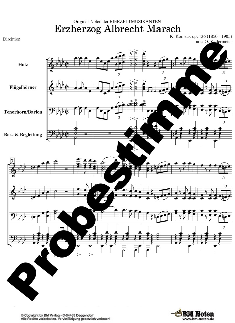 Dieser häufig gespielte Marsch ist nach dem österreichischen General Erzherzog Albrecht Friedrich von Österreich benannt. Der Komponist Karl Komzák junior war einer der berühmtesten Kapellmeister seiner Zeit. Interessant macht diesen Marschmusik-Klassiker der Wechsel vom 2/4-Takt auf den galoppierenden 6/8-Teil am Schluß. Der "Erzherzog-Albrecht-Marsch". Ein Muss für jede Blaskapelle! Und ein wirkungsvoller - nicht zu schwerer - Leckerbissen in der Marschmusik.