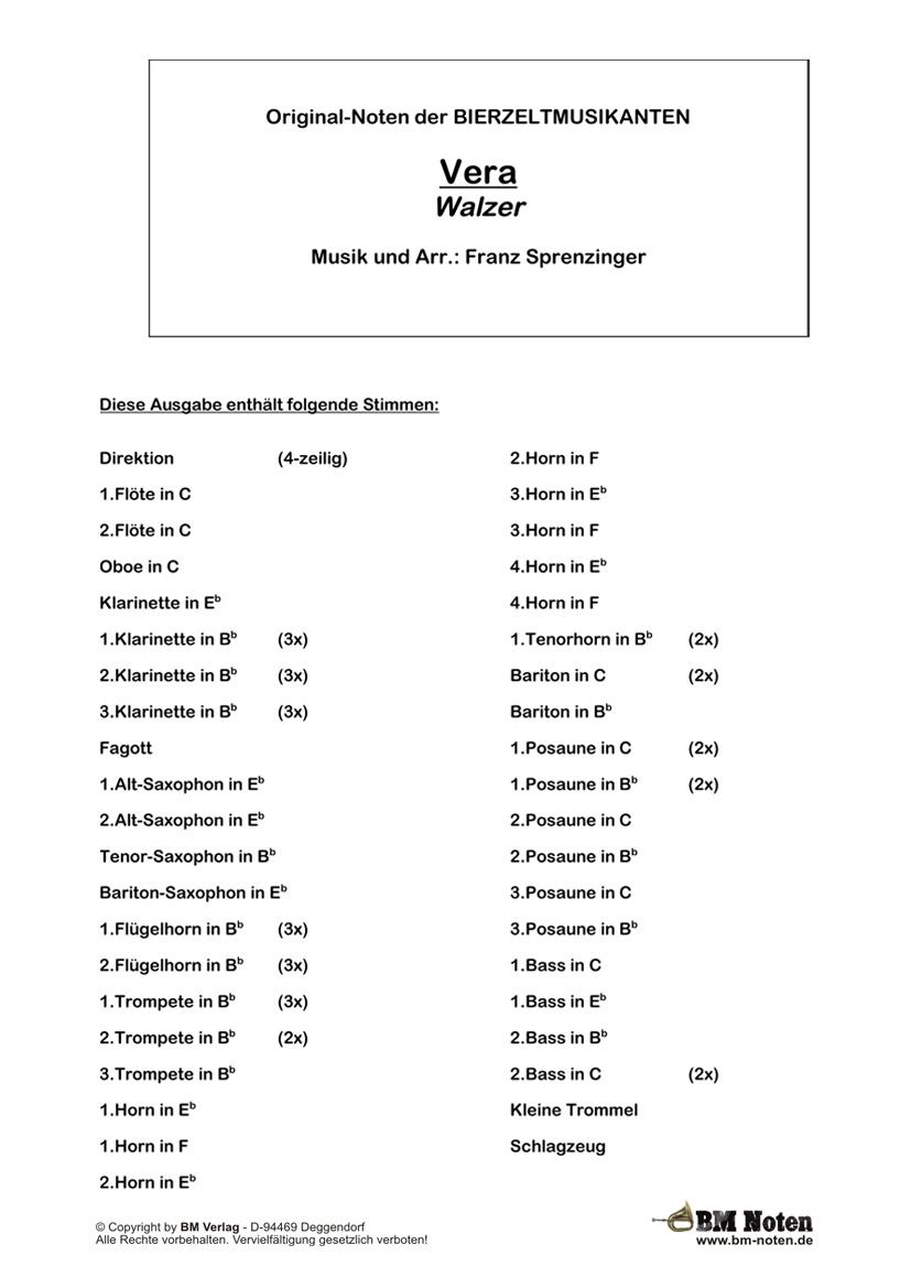 Dieses Stück hat Franz Sprenzinger, der Dirigent der Bierzeltmusikanten, zur Geburt seiner Tochter komponiert. Und wie seine Tochter heißt auch dieser Walzer "Vera". Die eingängige Melodie und die Nebenfiguren der Tenorhörner verleihen dieser Nummer einen hohen Wiedererkennungswert. Ein Original-Arrangement der Bierzeltmusikanten. Eine Aufnahme ist erschienen auf der CD "Einzug der Bierzeltmusikanten".
