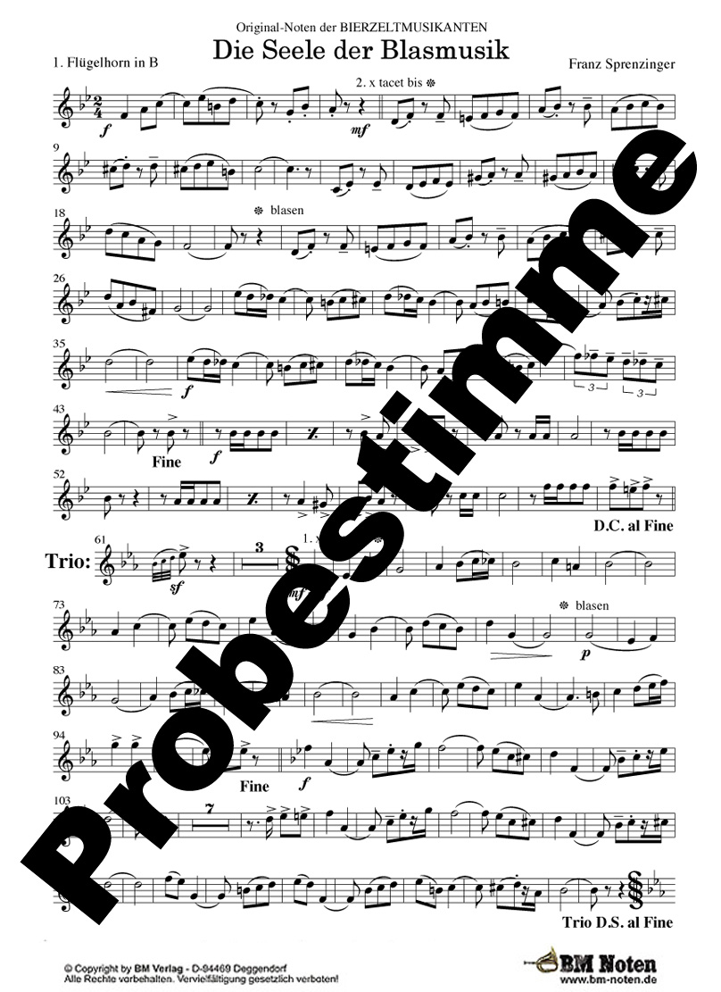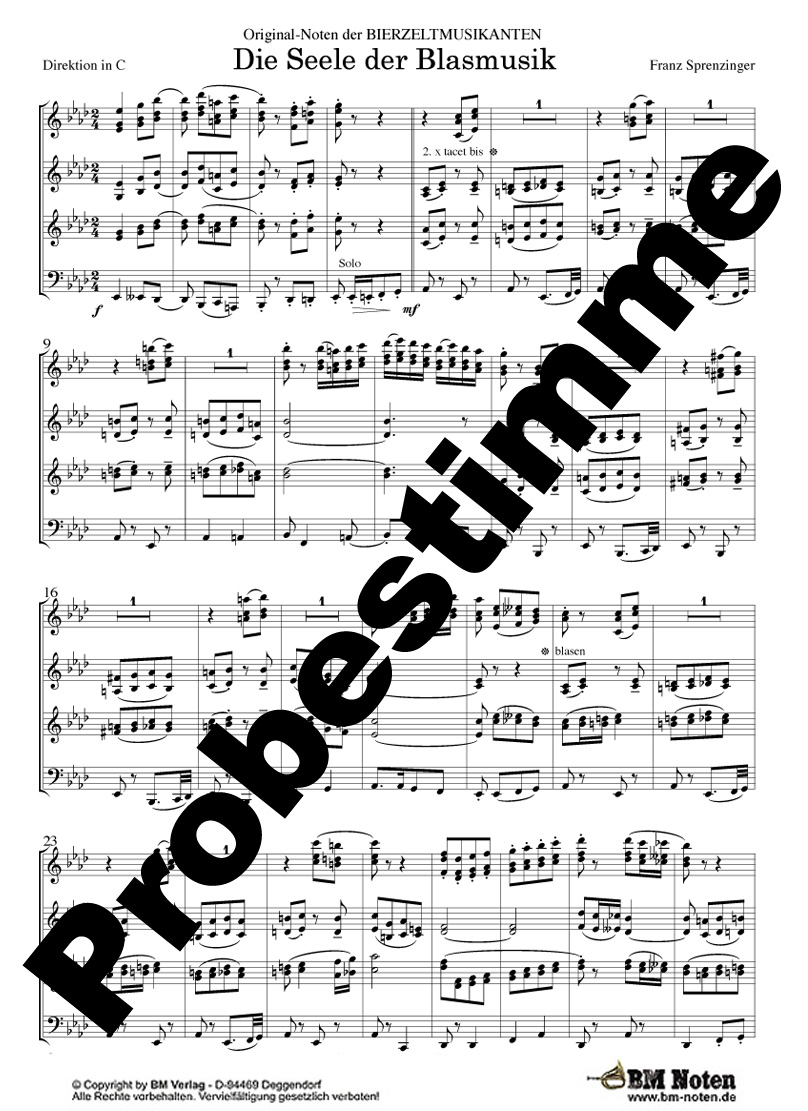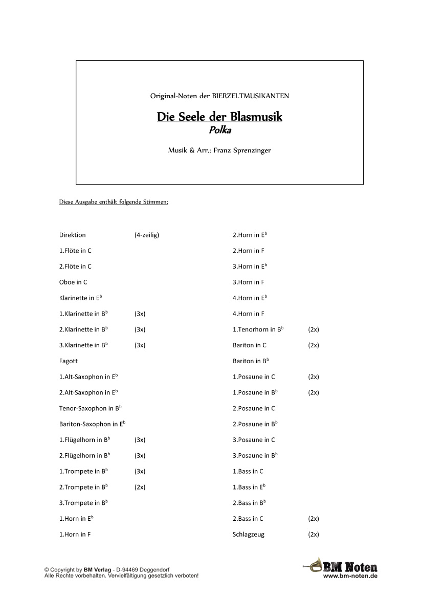Die Blasmusik hat eine Seele. Zumindest wenn es nach Franz Sprenzinger geht, der diese Polka komponiert hat. Stellt man sich die Seele als etwas Unsichtbares, Lebendiges und Konzentriertes vor, das einen eigenen und einzigartigen Charakter hat, so trifft diese Beschreibung ganz bestimmt auf die Blasmusik zu. Hauchen Sie Ihrem Publikum "die Seele der Blasmusik" zu.