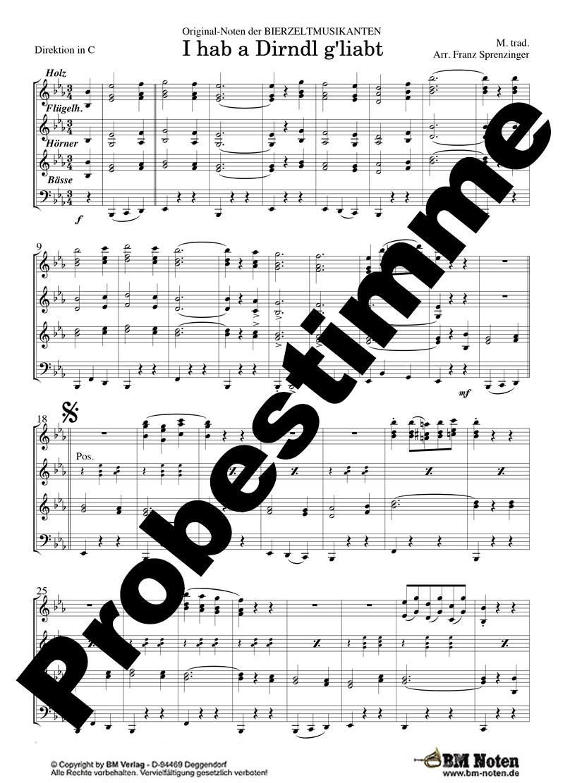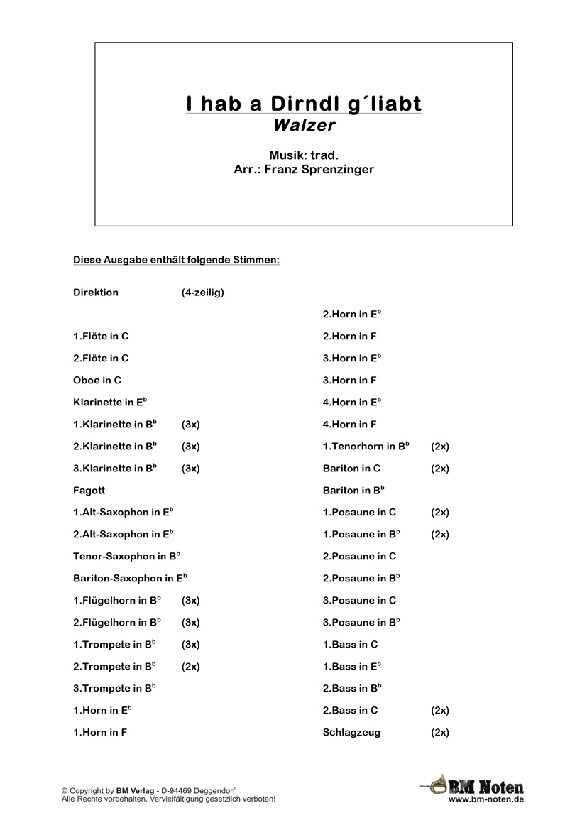 Ihr Publikum kann sich auf ein altes bayerisches Lied freuen. Aus dem Volksmusik-Schlager um die Liebe eines Buben zu einem Dirndl, das ihm erst die Augen verdreht und danach nichts mehr von ihm wissen will, weil sie einen anderen ins Herz schließt, hat Franz Sprenzinger ein schwungvolles Walzer-Arrangement mit Zwischenspielen gemacht, das sowohl mit als auch ohne Gesang aufgeführt werden kann.