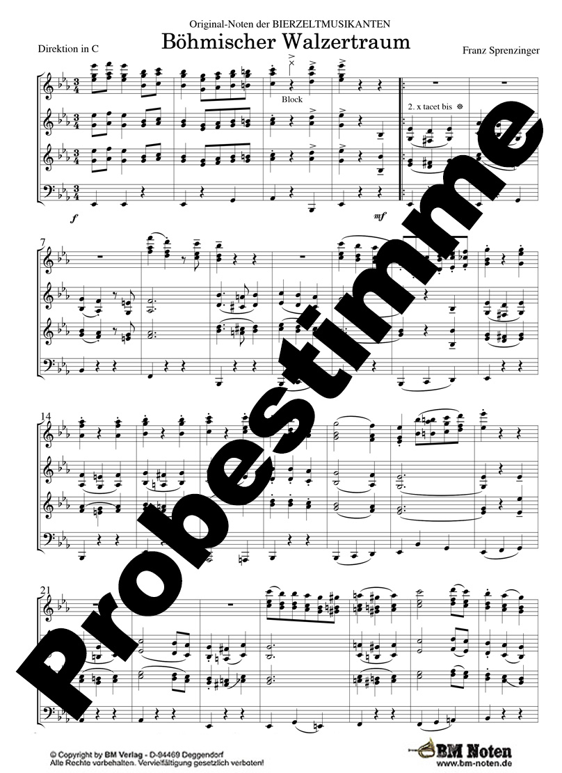 Ein Stück zum "Sich-im-Takt-Wiegen" und Träumen ist dieser typisch böhmisch-weiche Walzer von Franz Sprenzinger. "Böhmischer Walzertraum" heißt dieser Titel, in den der Kapellmeister der Bierzeltmusikanten alles hineingepackt hat, was man von einer böhmischen Komposition im bekannten Egerländer-Stil erwartet. Ein gefälliges Thema, ein Ohrwurm-Trio, ein Zwischenspiel für die Klarinetten und ein D.S. mit einem wunderbaren Nebensolo für das Hornregister. Der "Böhmische Walzertraum" ist auch in kleiner Besetzung spielbar. So hat das Hörbeispiel Franz Sprenzinger selbst am Akkordeon mit seinen fünf Kollegen vom "Ballastorchester" auf der ersten Ballastorchester-CD "Gut drauf" eingespielt. Bei diesem Artikel handelt es sich allerdings um die Ausgabe für großes Blasorchester.