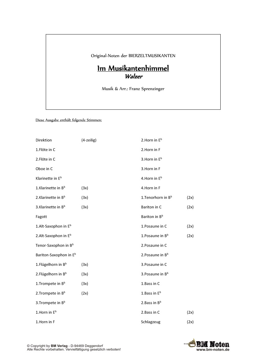 Ein wunderbarer Walzer von Franz Sprenzinger. "Im Musikantenhimmel" ist eine Komposition, aus der andere zwei oder gar drei Stücke zusammengestellt hätten. Jeder Teil würde für sich alleine als Trio durchgehen. Doch Franz Sprenzinger hat genau das nicht gemacht und ein melodiöses Walzerstück geschrieben, das einen förmlich mitnimmt und auch den unbeweglichsten Blasmusikfreund in ein leichtes schunkeln versetzt. Beim Hören dieses Walzers wird jedem klar, wie schön es "Im Musikantenhimmel" sein muss. Eine Originalaufnahme der Bierzetmusikanten dieses Walzers ist erhältlich auf der CD "Musikanten-Freundschaft".