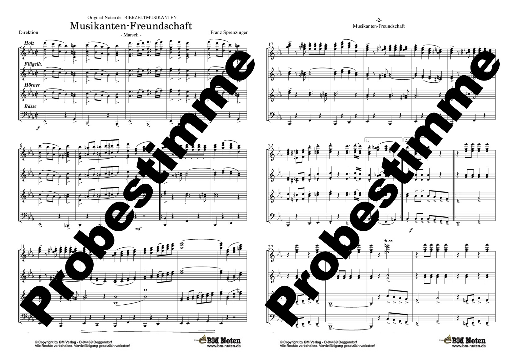 "Musikanten-Freundschaft" ist ein gewaltiger Marsch aus der Feder von Franz Sprenzinger. Auf den zackigen ersten Teil folgt ein wuchtiges Bass-Solo, das in das getragene Trio mündet und mit einem fulminanten Grandioso einen gewaltigen Schlusspunkt setzt. Das Ergebnis ist ein effektvoller Marsch, ein Aufhrocher, der bestimmt auch Ihr Publikum begeistert. Dieser Marsch ist das Stück, dessen Namen die Bierzeltmusikanten einer CD gegeben haben. Erschienen daher auch als Aufnahme der Bierzeltmusikanten auf der CD "Musikanten-Freundschaft".